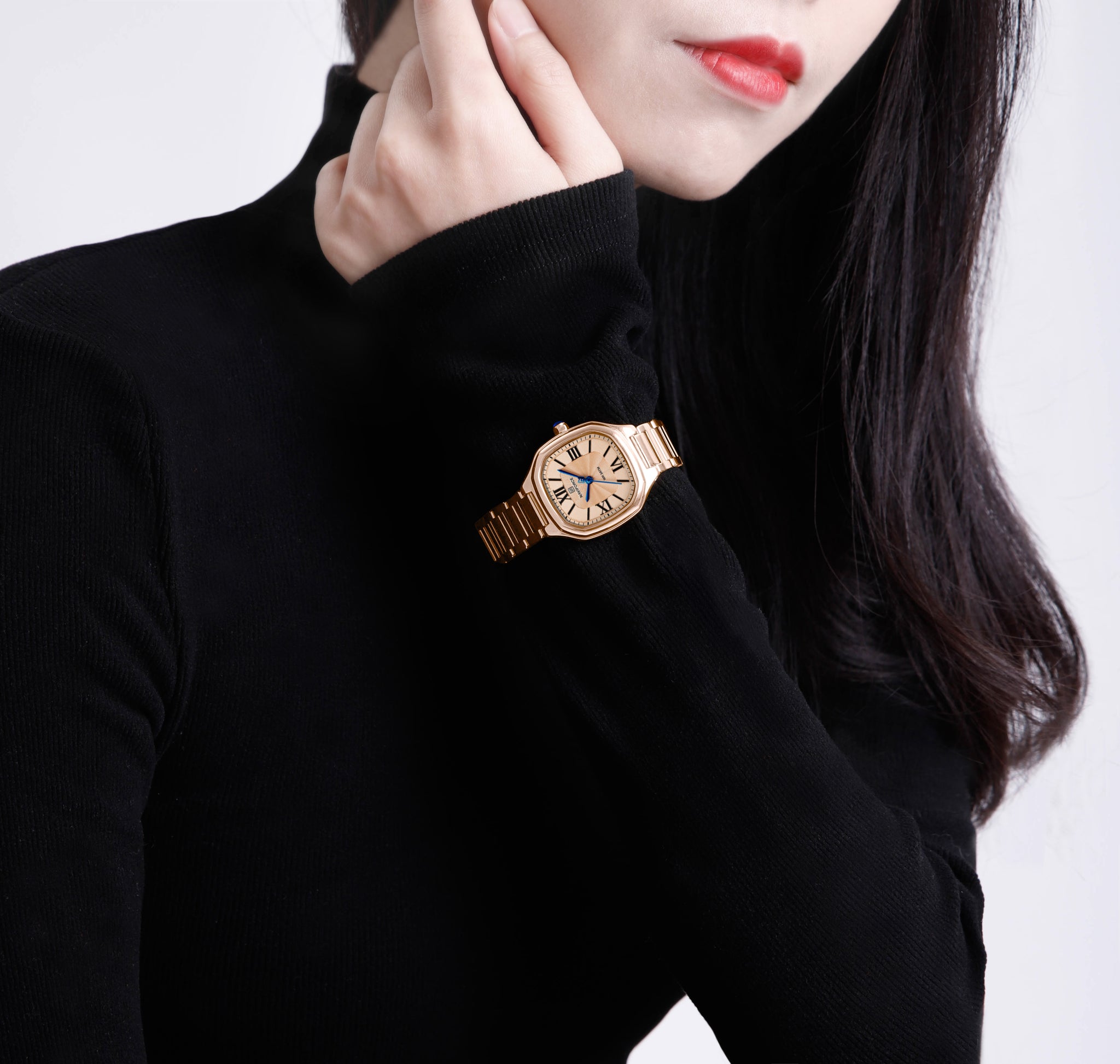 The softly contoured square case shimmers in warm rose tones, while the finely textured champagne dial draws the eye inward; intimate, almost hypnotic. Roman numerals add a timeless romance, and the striking blue hands glide gracefully across the face, creating a subtle contrast that feels bold yet undeniably elegant.