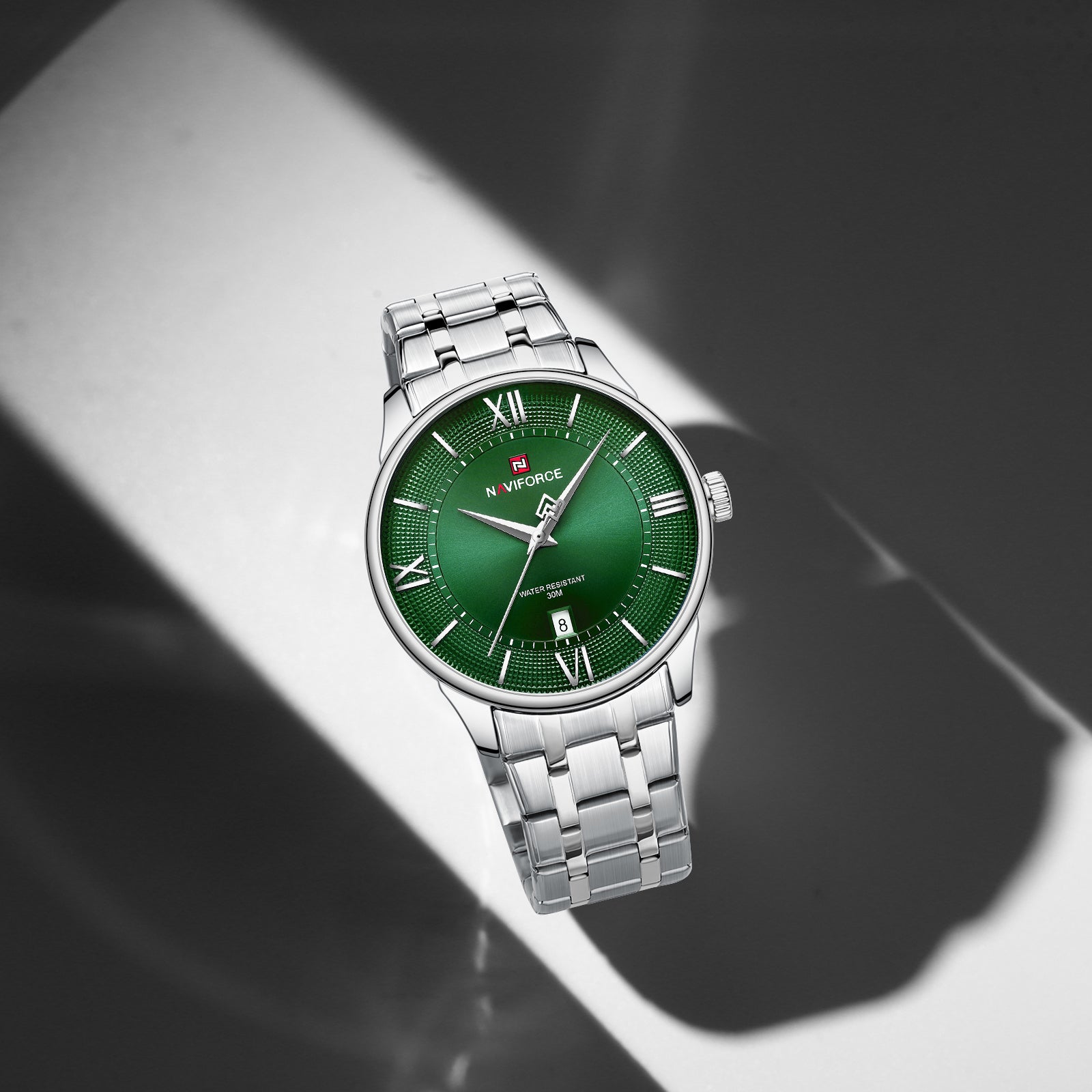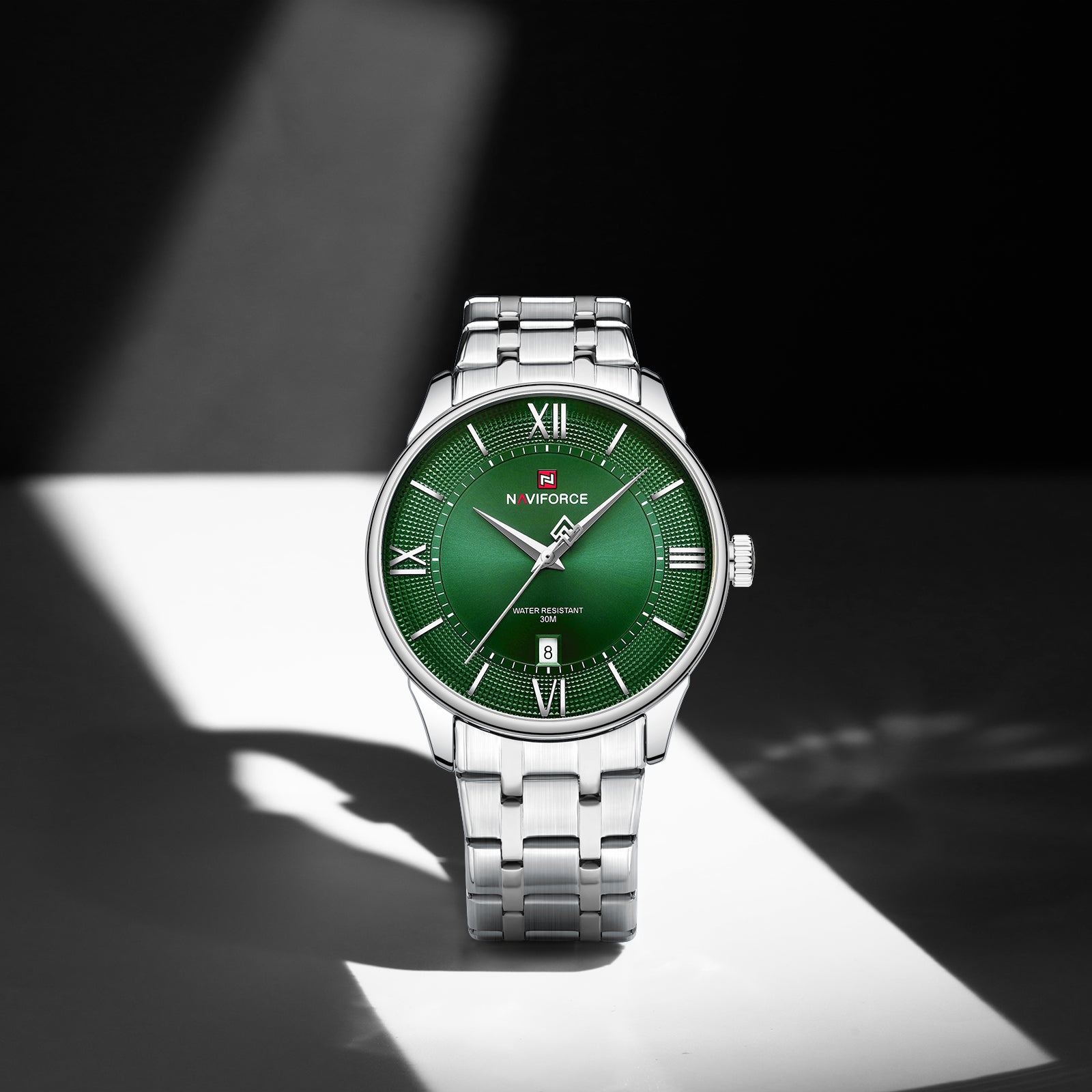 The Naviforce 9272 – Emerald Temptation Men’s Wrist Watch is designed for men who lead with presence, not noise. Its deep emerald green dial commands attention instantly, rich, hypnotic, and unapologetically bold, while the polished stainless steel bracelet delivers a cold, controlled strength that never goes unnoticed.